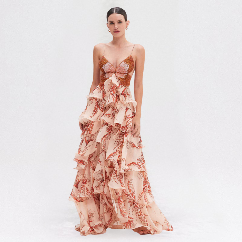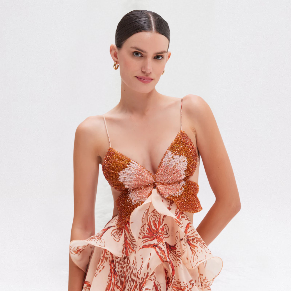 Rendi ogni occasione indimenticabile con l’Abito con Volant e Corpino Farfalla per Donna di Luca Milano. Creato per esaltare eleganza e femminilità, presenta un corpino a farfalla con perline, schiena scoperta con chiusura a fiocco e gonna a balze con volant, per un look romantico e raffinato.