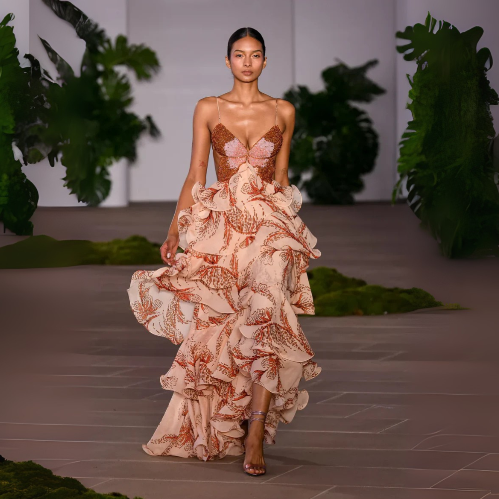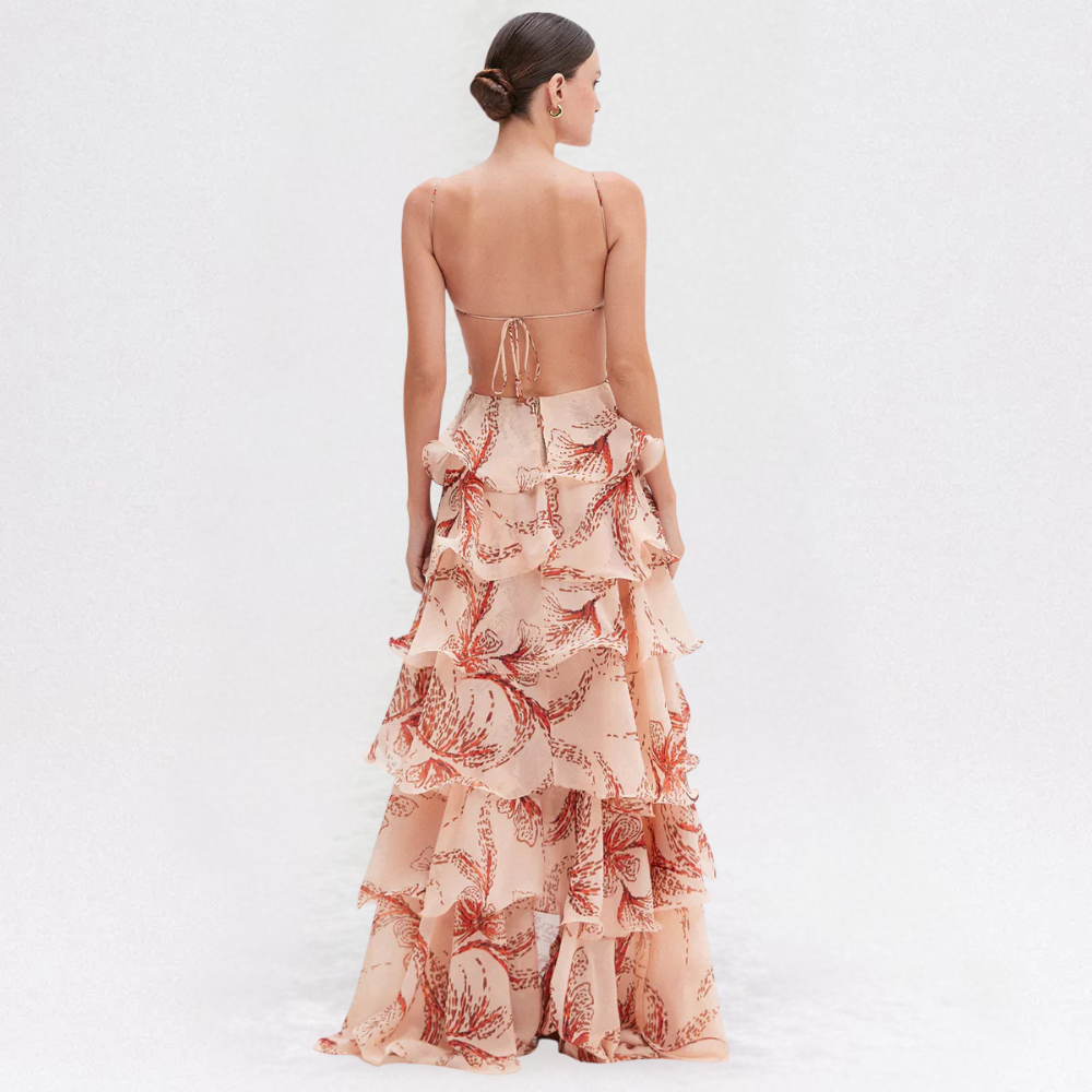 • Gonna lunga a balze con volant – Strati fluidi che donano movimento e leggerezza, ideali per eventi speciali e serate eleganti.